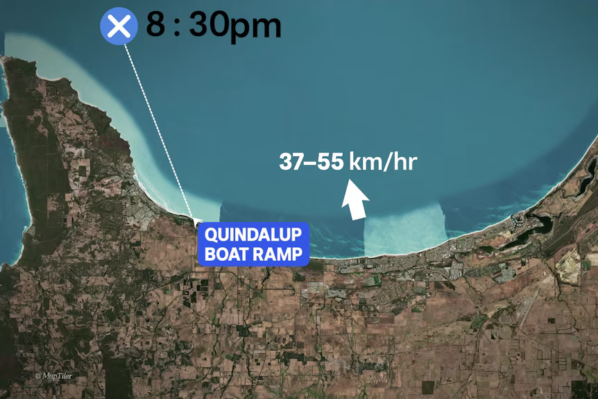 Ailenin Geographe Körfezi’nde yaklaşık olarak nerede bulunduğunu ve rüzgar hızını gösteren bir harita.