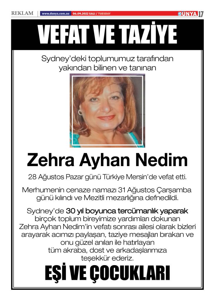 VEFAT SONRASI AİLESİ TARAFINDAN YAYINLANAN TAZİYE MESAJI