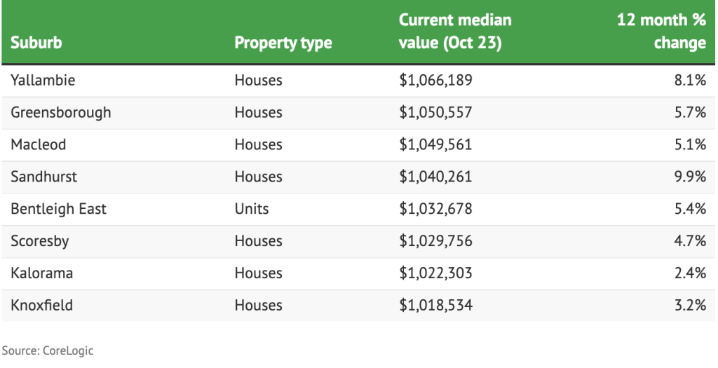 Scoresby (1,03 milyon dolar), Knoxfield (1,02 milyon dolar), Ringwood East (1,02 milyon dolar) ve Kalorama (1,02 milyon dolar) yer alıyor.