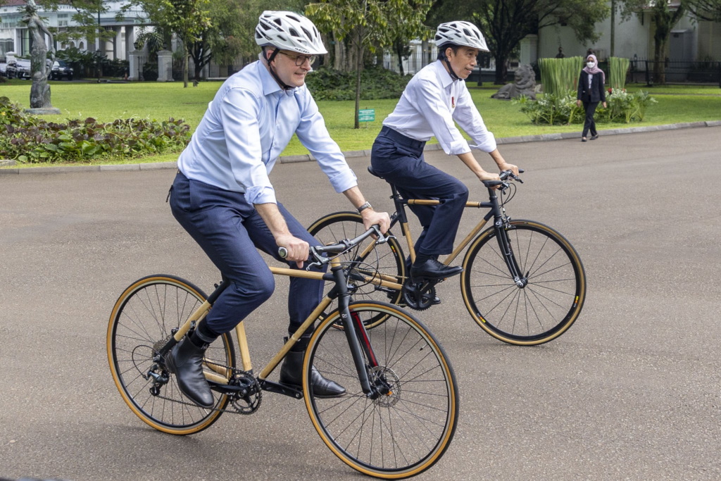 Anthony Albanese ve Joko Widodo, ziyaretin ilk gününde bisiklete binerek kentte kısa bir tur attılar.