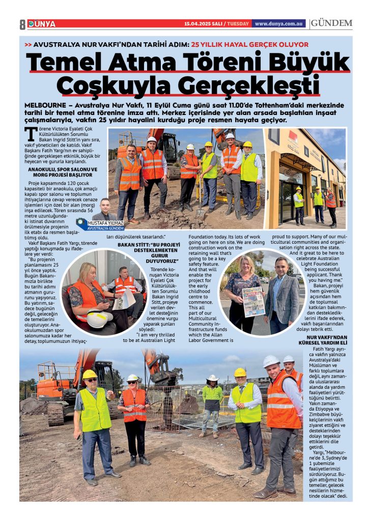 MELBOURNE – Avustralya Nur Vakfı, 11 Eylül Cuma günü saat 11.00’de Tottenham’daki merkezinde tarihi bir temel atma törenine imza attı. Merkez içerisinde yer alan arsada başlatılan inşaat çalışmalarıyla, vakfın 25 yıldır hayalini kurduğu proje resmen hayata geçiyor.