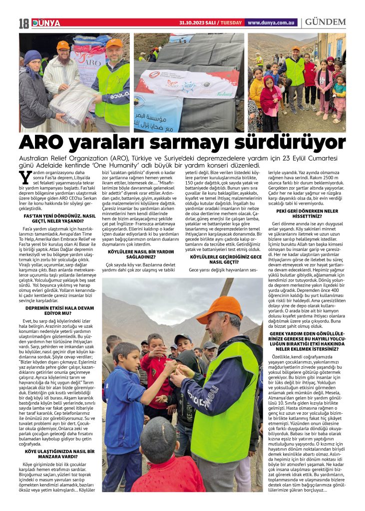 Australian Relief Organization (ARO), Türkiye ve Suriye’deki depremzedelere yardım için 23 Eylül Cumartesi günü Adelaide kentinde ‘One Humanity’ adlı büyük bir yardım konseri düzenledi. Yardım organizasyonu daha sonra Fas’ta deprem, Libya’da sel felaketi yaşanmasıyla tekrar bir yardım kampanyası başlattı. Fas’taki deprem bölgesine yardımları ulaştırmak üzere bölgeye giden ARO CEO’su Serkan İner ile konu hakkında bir söyleşi gerçekleştirdik.