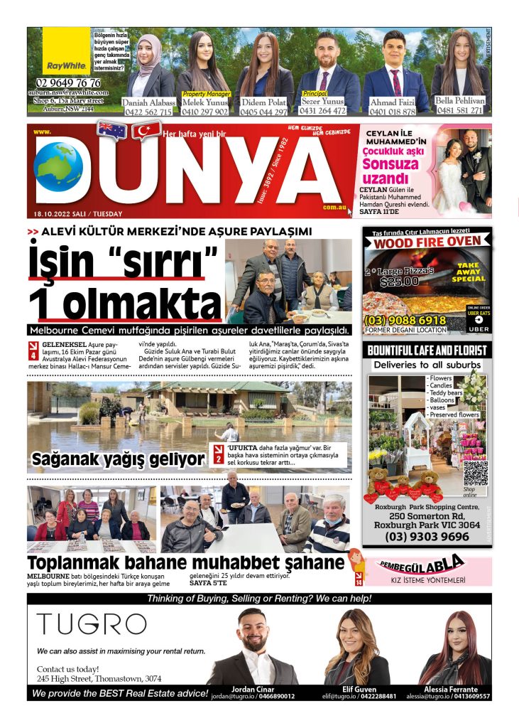 Dünya gazetesinin 18 Ekim tarihli yeni sayısı çıktı. Gazeteye, Melbourne ve Sydney’in seçkin mekanlarından ulaşabilirsiniz.