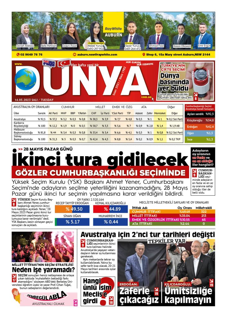 Dünya gazetesinin 16 Mayıs 2023 tarihli yeni sayısı çıktı. Gazeteye Melbourne ve Sydney’in seçkin mekanlarından ulaşabilirsiniz.
