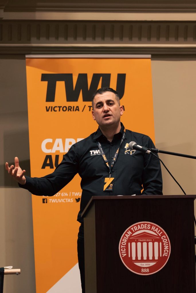 Victoria ve Tasmania Ulaştırma Sendikası Başkanı Mem (Mehmet) Süleyman, ticari olmayan sözleşmelerin, dizginsiz tedarik zinciri baskılarının ve Amazon Flex gibi iş modellerinin yarattığı haksız rekabetin ölümcül sonuçlarına dikkat çekti. Foto: Tedarik