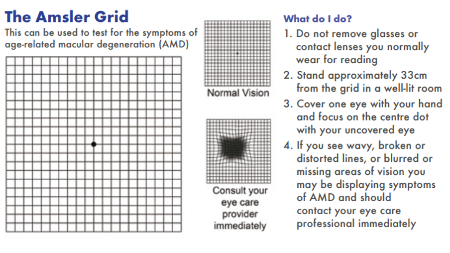 Your optometrist can run tests to diagnose the presence of AMD. The tests involved are dilated back of the eye examination (using eye drops to dilate the pupil) and using OCT scan (ultrasound) and retinal camera scan to assess the health of the macular. People over the age of 50 should have their eyes examined, and those over the age of 65 years should have an eye examination once a year.