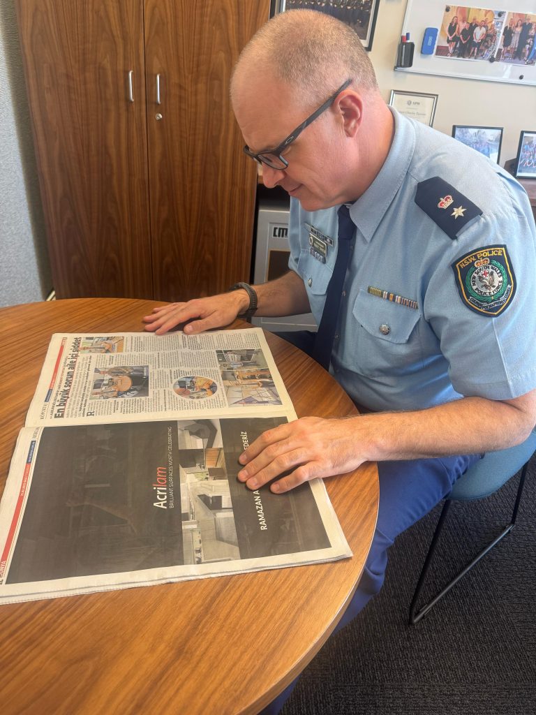 Auburn Emniyet Amiri Robert Toynton, 1982 yılından bu yana Avustralya’da Türkçe yayın yapan Dünya Gazetesinin son sayısını inceliyor. (Dünya Newspaper)