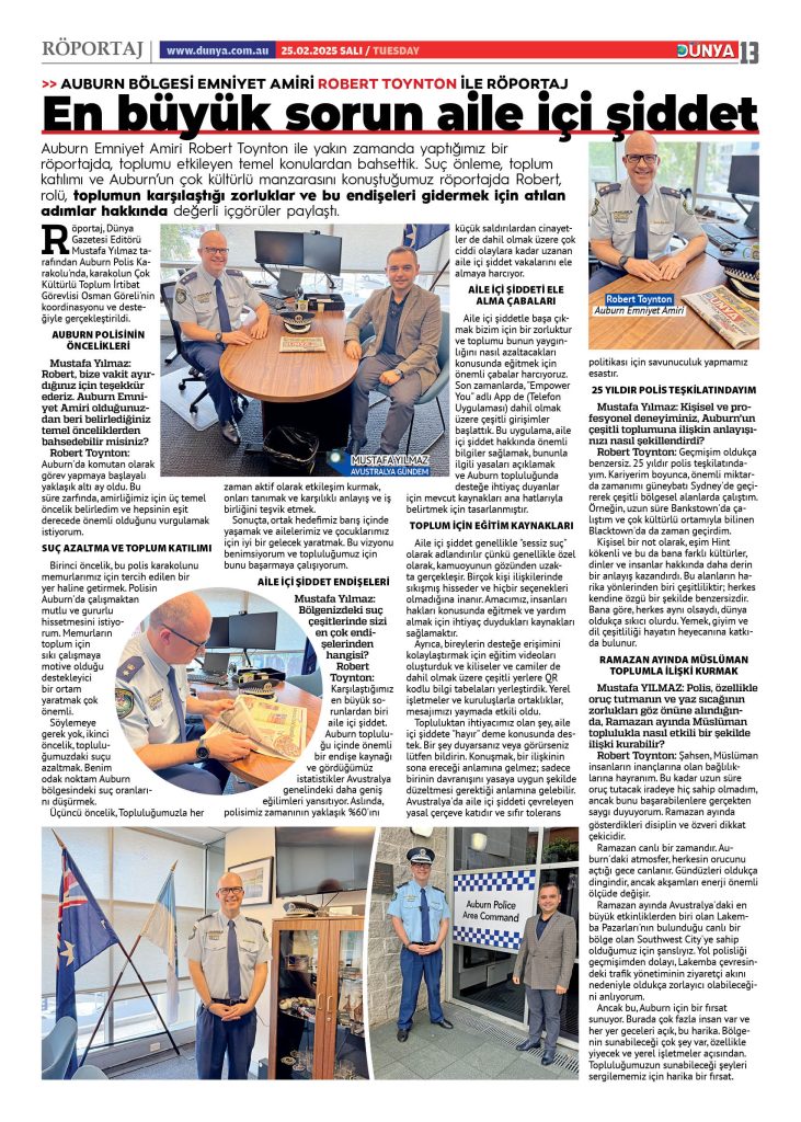 Auburn Emniyet Amiri Robert Toynton ile yakın zamanda yaptığımız bir röportajda, toplumu etkileyen temel konulardan bahsettik. Suç önleme, toplum katılımı ve Auburn’un çok kültürlü manzarasını konuştuğumuz röportajda Robert, rolü, toplumun karşılaştığı zorluklar ve bu endişeleri gidermek için atılan adımlar hakkında değerli içgörüler paylaştı. Röportaj, Dünya Gazetesi Editörü Mustafa Yılmaz tarafından Auburn Polis Karakolu’nda, karakolun Çok Kültürlü Toplum İrtibat Görevlisi Osman Göreli’nin koordinasyonu ve desteğiyle gerçekleştirildi.