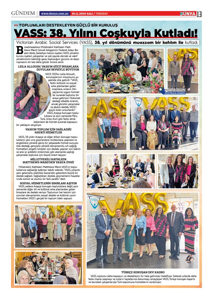 Victorian Arabic Social Services (VASS), 38. yıl dönümünü muazzam bir katılım ile kutladı. Broadmeadows Milletvekili Kathleen Matthews-Ward, Calwel bölgesinin Federal Adayı Basem Abdo, belediye meclis üyeleri, VASS yönetim kurulu üyeleri, çalışanlar ve çok sayıda dernek ve vakıf yöneticisinin katıldığı gece, topluluğun gücünü ve dayanışmasını bir kez daha gözler önüne serdi.