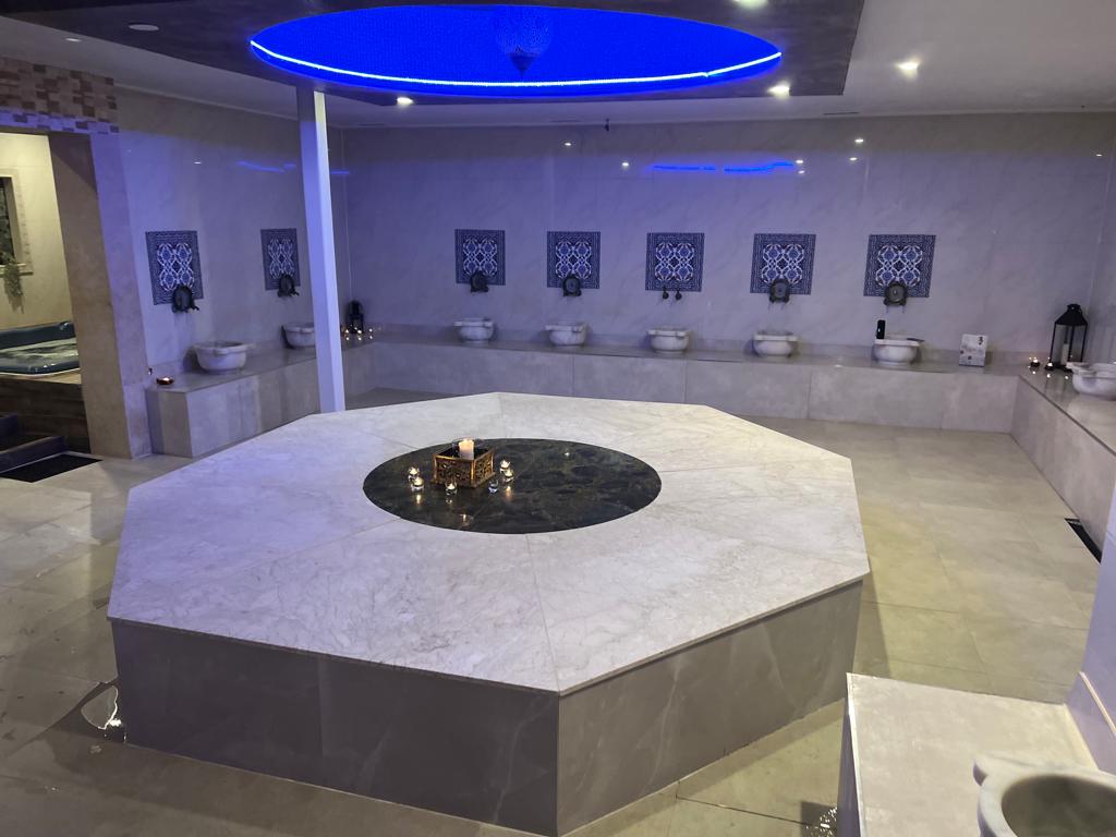 Emine Kurt: Hamamın içi Türkiye’den. Bizi çocukken annem nasıl bir hamama götürüyorsa ona benzer bir sistem yaptık. Kurnalar, çeşmeler, göbek taşı hep Türkiye’den… Spa ile de otantikliğin içine biraz da modern bir katkı sağlamak istedik. Sabunlarımızı, keselerimizi, peştamellerimizi bile Türkiye’den getiriyoruz.