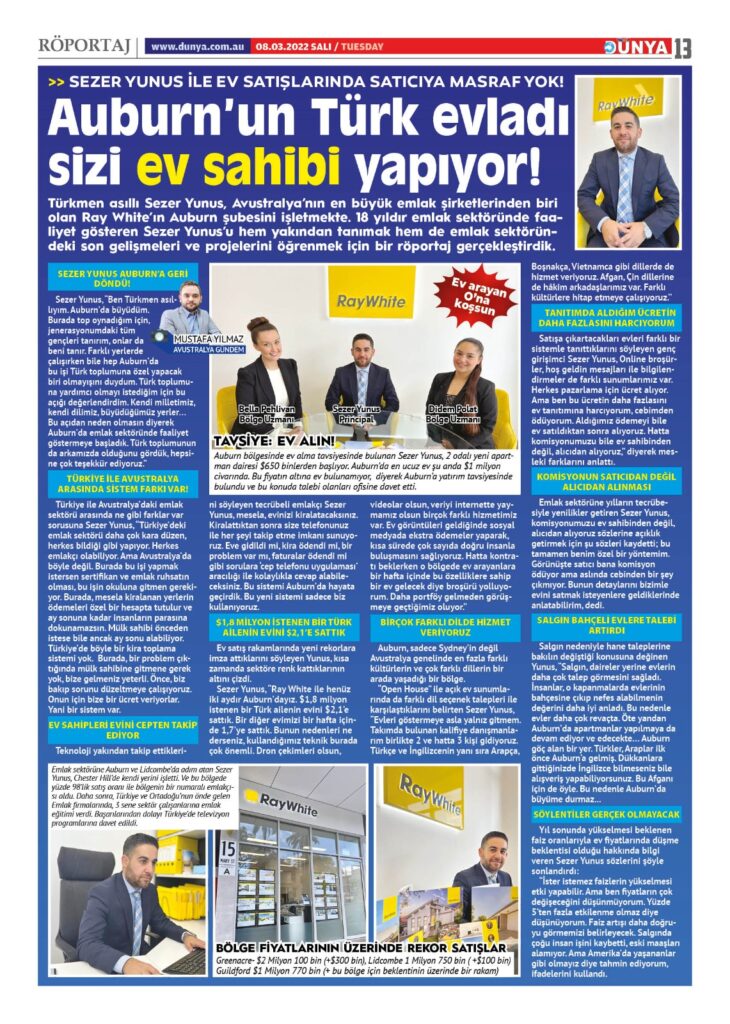 Türkmen asıllı Sezer Yunus, Avustralya’nın en büyük emlak şirketlerinden biri olan Ray White’ın Auburn şubesini işletmekte. 18 yıldır emlak sektöründe faaliyet gösteren Sezer Yunus’u hem yakından tanımak hem de emlak sektöründeki son gelişmeleri ve projelerini öğrenmek için bir röportaj gerçekleştirdik.