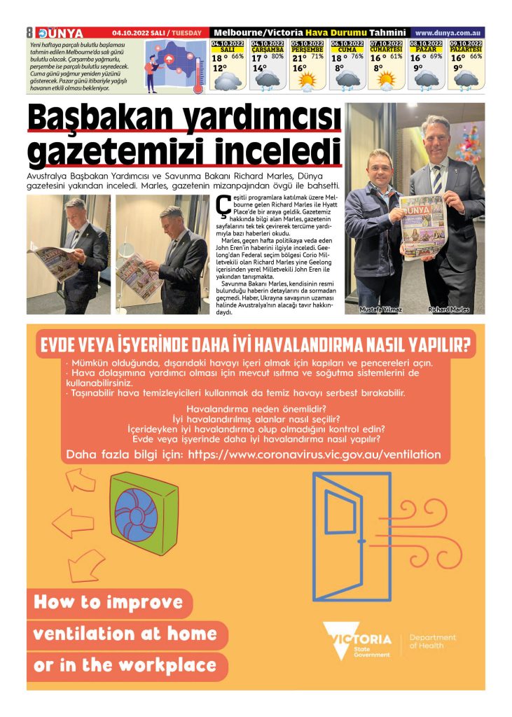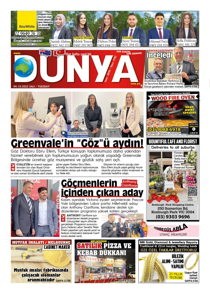 Dünya gazetesinin 4 Ekim tarihli yeni sayısı çıktı. Gazeteye, Melbourne ve Sydney’in seçkin mekanlarından ulaşabilirsiniz.