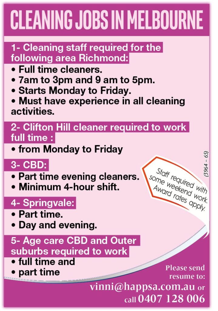 Melbourne Happsa firması, kent genelinde temizlik elemanları arıyor.