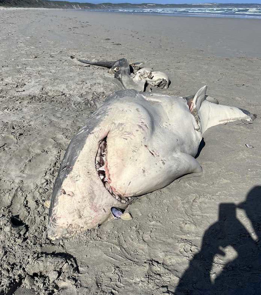 Üç metrelik köpekbalığı, Portland’ın güneybatısındaki Bridgewater Burnu’nun kıyısında kısmen yenilmiş halde bulundu. Büyük beyazın başı ve kuyruğu sağlamdı, ancak yırtıcı hayvanın orta bölümünden geriye çok az şey kalmıştı.