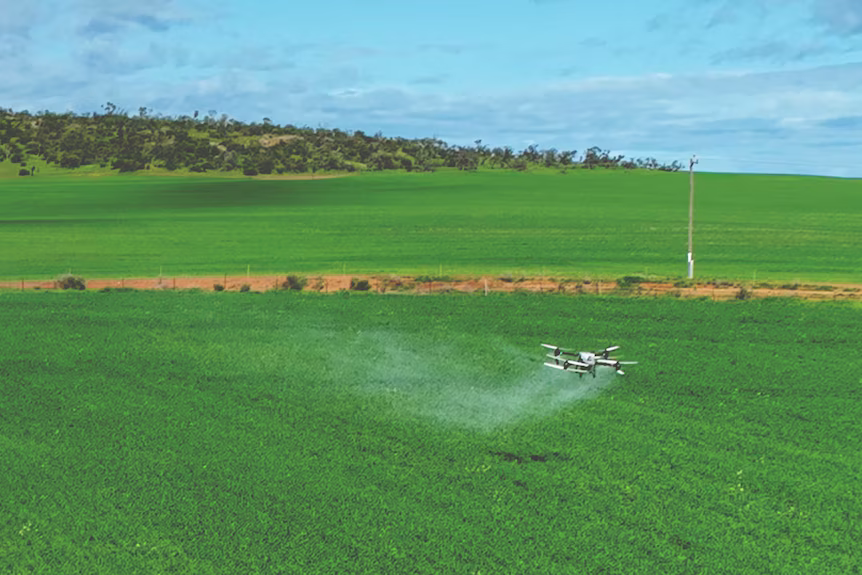Geraldton çevresindeki su basmış tarlalara gübre ve kimyasallar uygulamak için helikopterler, uçaklar ve dronlar kullanılıyor. Andrew ve Stuart Vlahov, Nabawa ve Ellendale’de, Perth’in 400 kilometre doğusundaki bölgede, Haziran ayından bu yana 420 milimetre yağış aldılar ve bu nedenle erişilemeyen tarlaları için bir drone satın aldılar.
