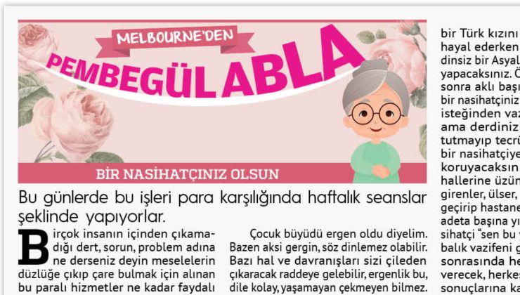 Bu günlerde bu işleri para karşılığında haftalık seanslar şeklinde yapıyorlar. Birçok insanın içinden çıkamadığı dert, sorun, problem adına ne derseniz deyin meselelerin düzlüğe çıkıp çare bulmak için alınan bu paralı hizmetler ne kadar faydalı veya çalışıp çalışmadığı tartışılır. “Soran dağlar aşmış, sormayan düz yolda şaşmış” demiş atalarımız. Ardından derdini söylemeyen derman bulamaz da deriz. Ama sorunumuzu veya derdimizi kime sorup danışacağız, kimden fikir alıp son kararımızı vereceğiz, bu da önemli bir durumdur. Bir nasihat edeniniz olsun diyecektim.