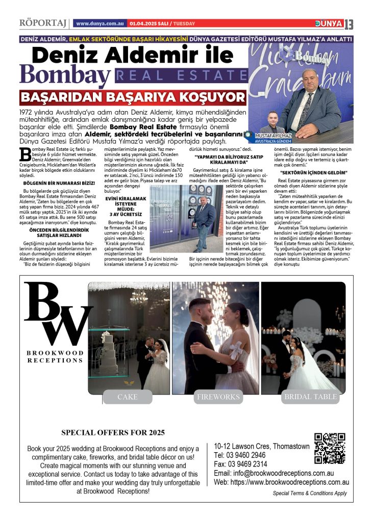 Avustralya Türk toplumu üyelerinin kendisini ve ürettiği değerleri tanımasını istediğini sözlerine ekleyen Bombay Real Estate firması sahibi Deniz Aldemir, “İş yoğunluğumuz çok güzel. Türkçe konuşan toplum üyelerimize de yardımcı olmak isteriz. Ekibimize güveniyorum.” diye konuştu.