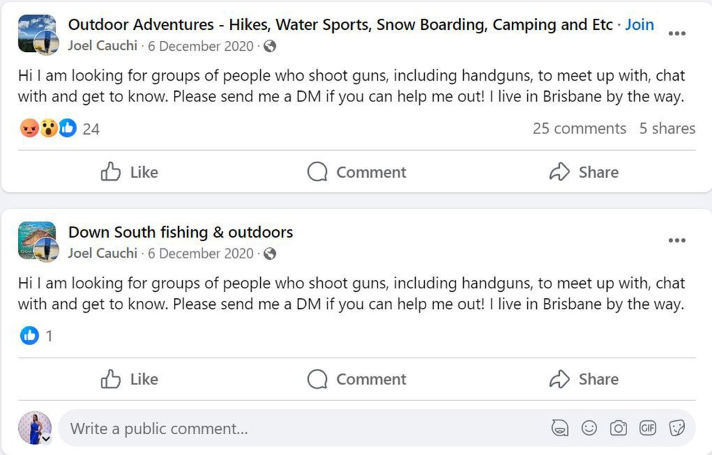 2020’den itibaren iki ayrı Facebook grubundaki gönderileri, Cauchi’nin “buluşmak, sohbet etmek ve tanışmak için tabancalar da dahil olmak üzere silahlarla ateş eden insan gruplarını” aradığını gösteriyor.