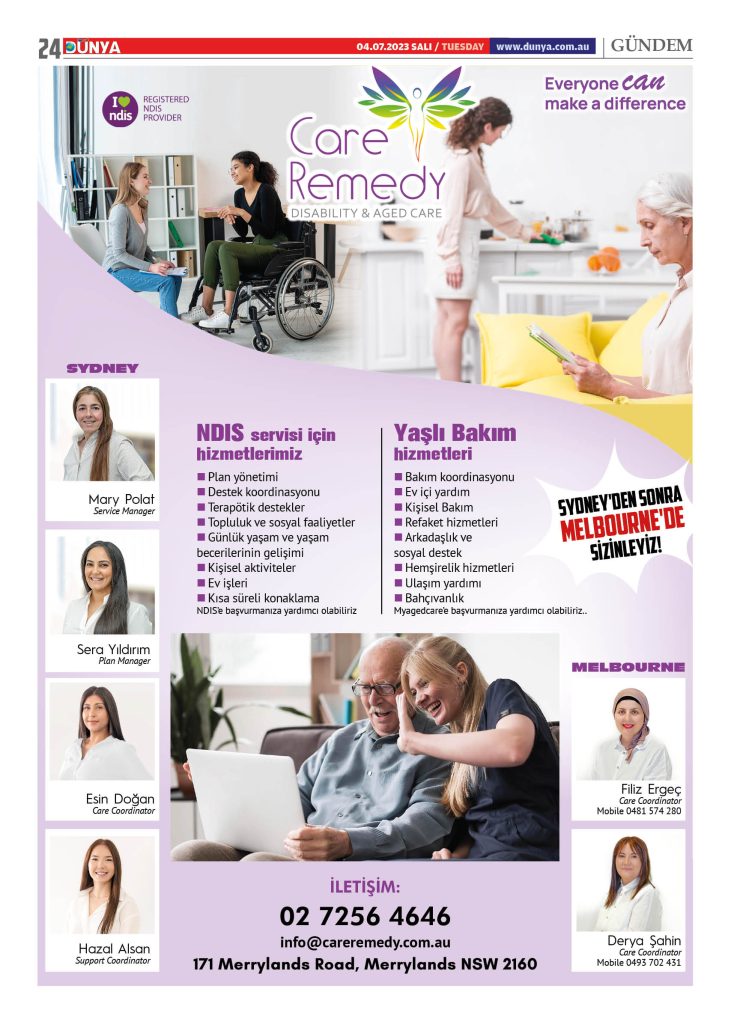 Sydney’de olduğu gibi Melbourne kentinin de birçok bölgesini kapsayacak hizmetler sağlayacak Care Remedy, özellikle 65 yaş altına başvurusu yapan ancak NDIS hizmeti çıkmayan kişilere AgeCare üzerinden başvuru sağlayabiliyor.