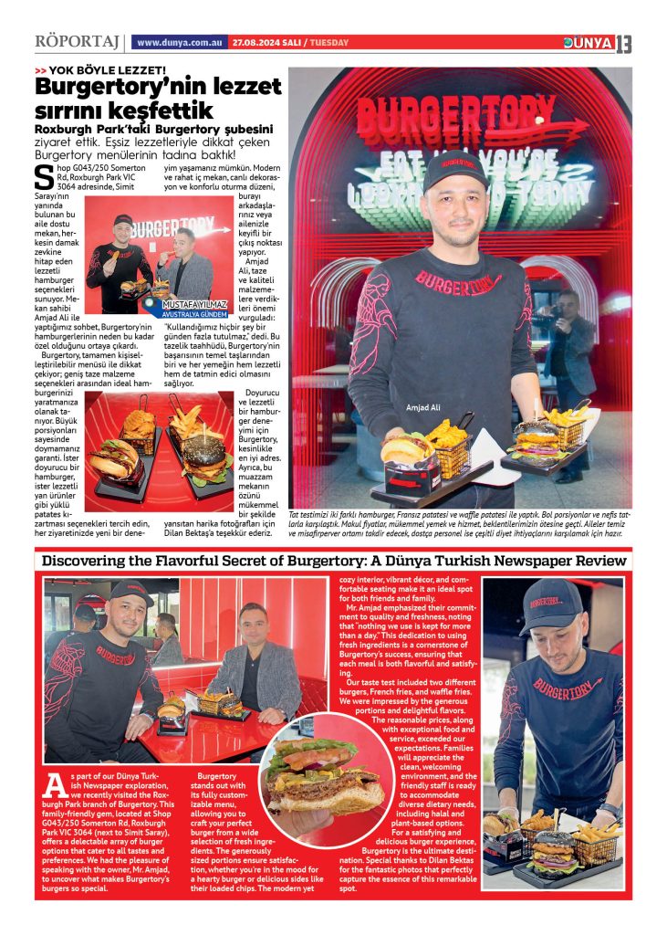 Dünya Gazetesi olarak Roxburgh Park’taki Burgertory şubesini ziyaret ettik. Shop G043/250 Somerton Rd, Roxburgh Park VIC 3064 adresinde, Simit Sarayı’nın yanında bulunan bu aile dostu mekan, herkesin damak zevkine hitap eden lezzetli hamburger seçenekleri sunuyor. Mekan sahibi Amjad Ali ile yaptığımız sohbet, Burgertory’nin hamburgerlerinin neden bu kadar özel olduğunu ortaya çıkardı.