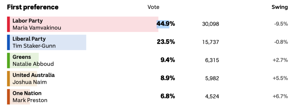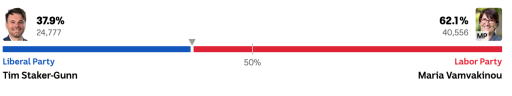 Pazartesi günü gecesi, Calwell seçim bölgesinde sayılan 71.222 oydan 30,098’ini Maria Vamvakinou aldı. İlk tercih oylarında Vamvakinou, oyların %44.9’ını aldığı görüldü.