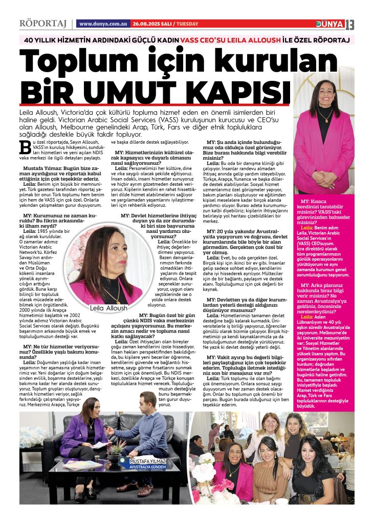 Bu özel röportajda, Sayın Alloush, VASS’ın kuruluş hikâyesini, sundukları hizmetleri ve yeni açılan NDIS vaka merkezi ile ilgili detayları paylaştı.