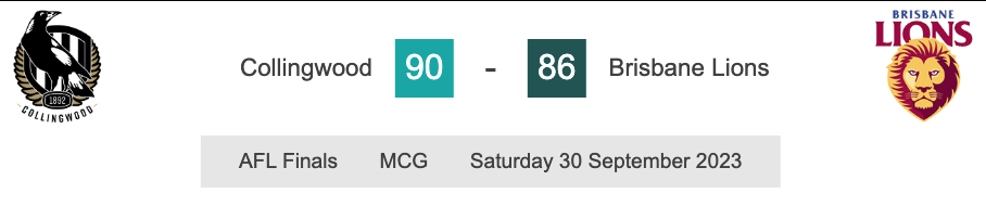 Son dakikada topu başarıyla kontrol altına alan Collingwood, zaferi dört puanla taçlandırdı. Collingwood oyuncuları, bu muhteşem zaferin ardından büyük mutluluk yaşadılar. Diğer taraftan, Brisbane Lions oyuncuları ellerinden geleni yapmalarına rağmen karşılaşmanın sonunda üzüntülerini yere uzanarak ifade ettiler.