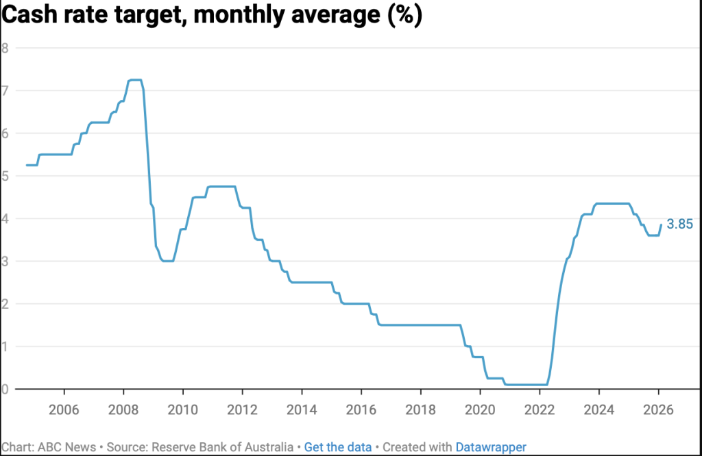 RBA, Şubat ayı toplantısında politika faizini 0,25 puan artırarak yüzde 3,85 seviyesine çıkardı. Kararın ardından Commonwealth Bank, Westpac, NAB ve ANZ değişken faizli konut kredilerinde artışa gideceklerini duyurdu.