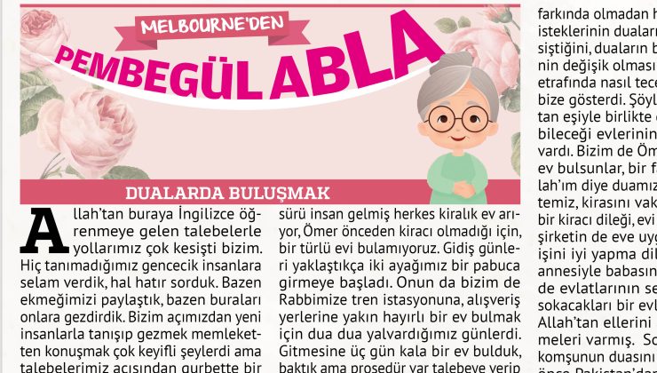 İşte Ömer talebeye geri geldiklerinde eşiyle beraber yaşayacakları bu şirin evi bulma telaşından sonra farkında olmadan herkesin farklı farklı isteklerinin dualarının bu noktada kesiştiğini, duaların beklentilerin hepsinin değişik olmasına rağmen bir evin etrafında nasıl tecelli ettiğini Rabbim bize gösterdi. Şöyle ki; Ömer in Allah tan eşiyle birlikte geldiğinde yaşayabileceği evlerinin olması için duası vardı. Bizim de Ömer’e hayırlısıyla bir ev bulsunlar, bir faydamız olsun Allah’ım diye duamız vardı. Ev sahibinin temiz, kirasını vaktinde ödeyecek iyi bir kiracı dileği, evi kiraya verecek olan şirketin de eve uygun kiracıyı bulma, işini iyi yapma dileği vardı. Ömer’in annesiyle babasının da gurbet ellerde evlatlarının selametle başlarını sokacakları bir evleri olsun için Yüce Allah’tan ellerini açıp dua dua istemeleri varmış. Sonradan Pakistanlı komşunun duasını da öğrendik. Bir yıl önce Pakistan’dan gelin gelmiş, çok yalnız kalmış, namazlarında Allah’ım bize hayırlı iyi bir komşu nasip eyle” diye hep dua edermiş. Bunları duyunca Ömer ile evlenip gelen gelin hanımda “vallahi bende hep Allah’ım şirin bir evim olsun, iyi bir komşum olsun diye dua eder dururdum, ne güzel Allah bize hepsini nasip etti” diye sevinçle duasının kabul olduğundan haber verdi. Bir evin etrafında herkes kendince bir şey istedi, ne güzel Rabbimiz de herkesin gönlüne göre verdi.