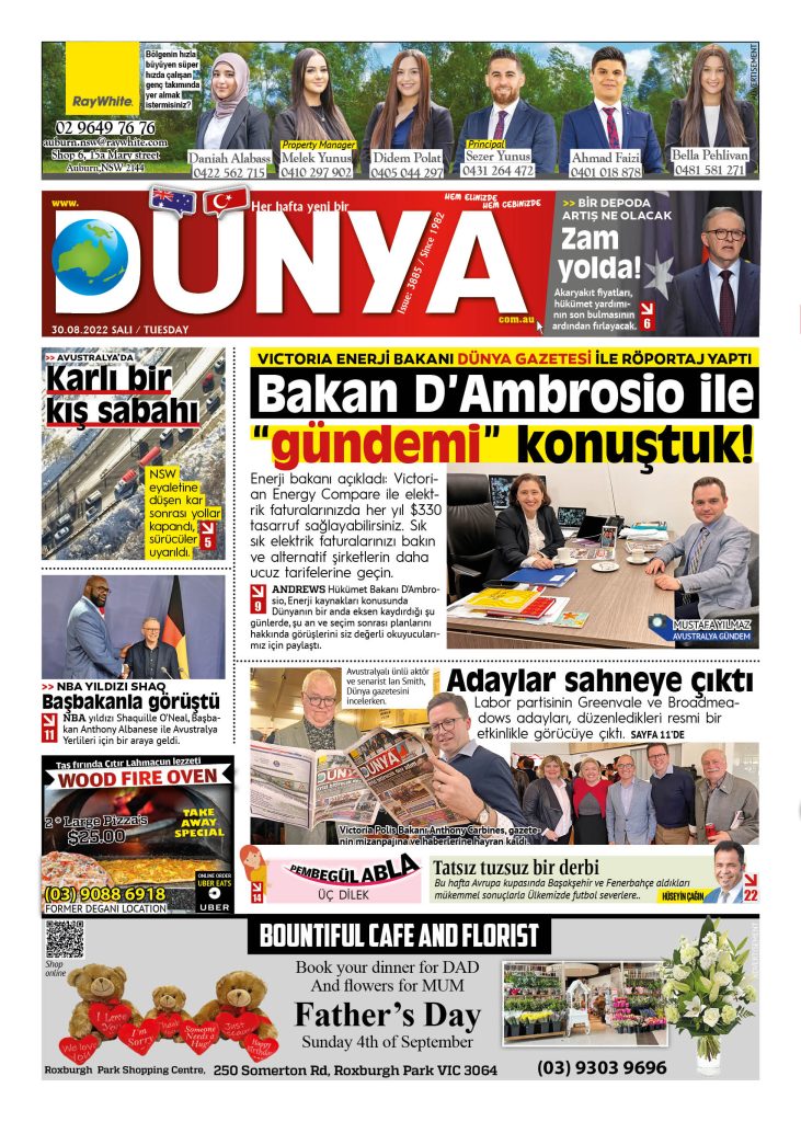 Dünya gazetesinin 30 Ağustos tarihli yeni sayısı çıktı. Gazeteye, Melbourne ve Sydney’in seçkin mekanlarından ulaşabilirsiniz.
