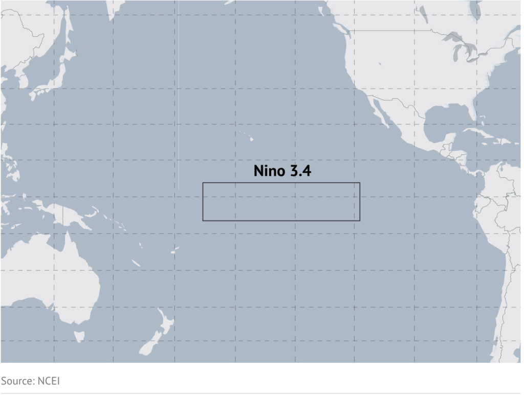 Bilim insanları Pasifik’i bölümlere ayırıyor. El Nino’yu tahmin etmek için Uluslararası Tarih Çizgisi üzerinde yer alan ve Nino 3.4 olarak adlandırılan dikdörtgen su şeridine odaklanıyorlar (yukarıdaki resme bakın). Dört ana kriteri var.