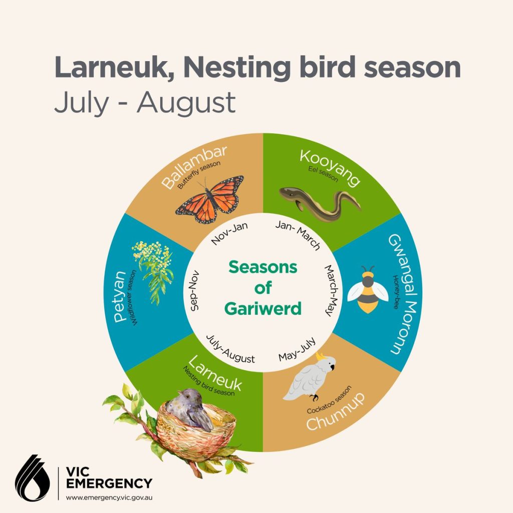 VicEmergency tarafından yapılan açıklamada, Avustralya Meteoroloji Bürosu’nun (BOM) web sitesinde yer alan takvimde, “Larneuk” mevsiminin yağmurun gelişiyle ilişkilendirildiği belirtildi. Bu dönem, doğanın uyanışına, kuşların yuva yapmasına ve bazı bitkilerin çiçek açmaya başlamasına işaret ediyor.