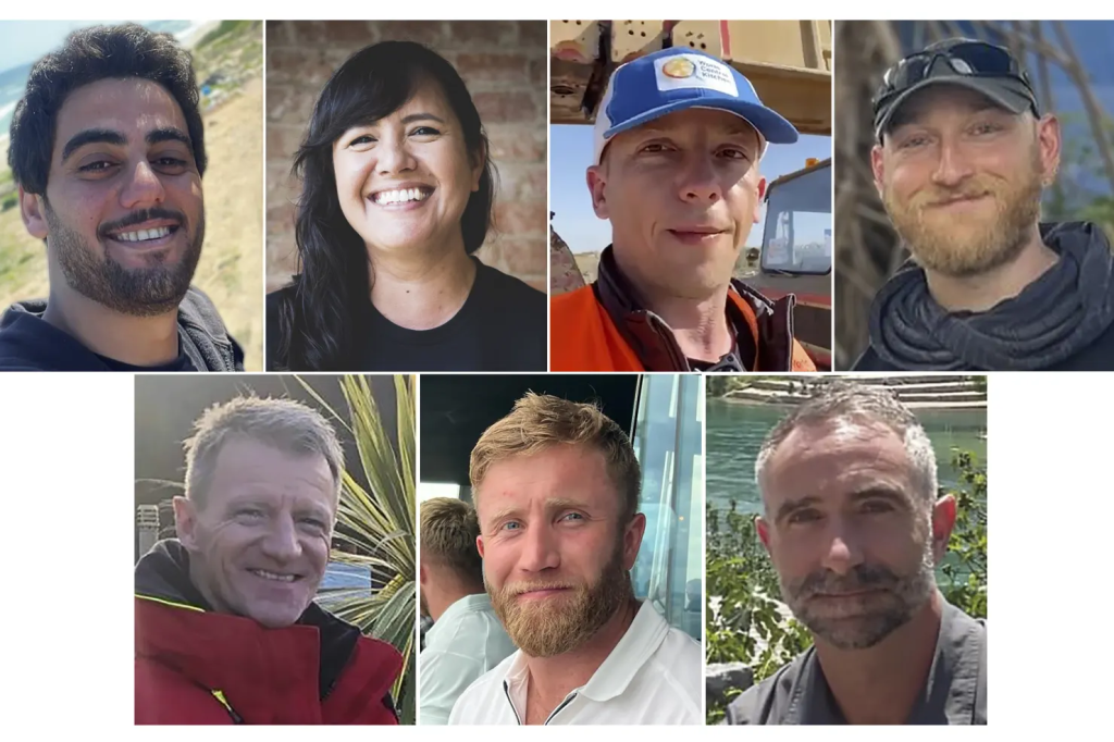 (Sol üstten saat yönünde): Filistinli Saifeddin Issam Ayad Abutaha, Avustralya’dan Lalzawmi “Zomi” Frankcom, Polonya’dan Damian Soból, ABD ve Kanada’dan Jacob Flickinger ve Britanya’dan James Kirby, James Henderson ve John Chapman öldürüldü. İsrail hava saldırısı. KREDİ: AP