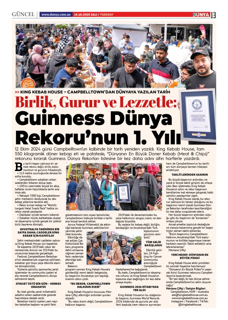 King Kebab House’un bu olağanüstü başarısı, Guinness World Records 2026 kitabında da gururla yer aldı. Yeni baskıda, hem rekorun ayrıntıları hem de Campbelltown’un bu tarihi anı tüm dünyaya tanıtan hikayesi anlatılıyor.