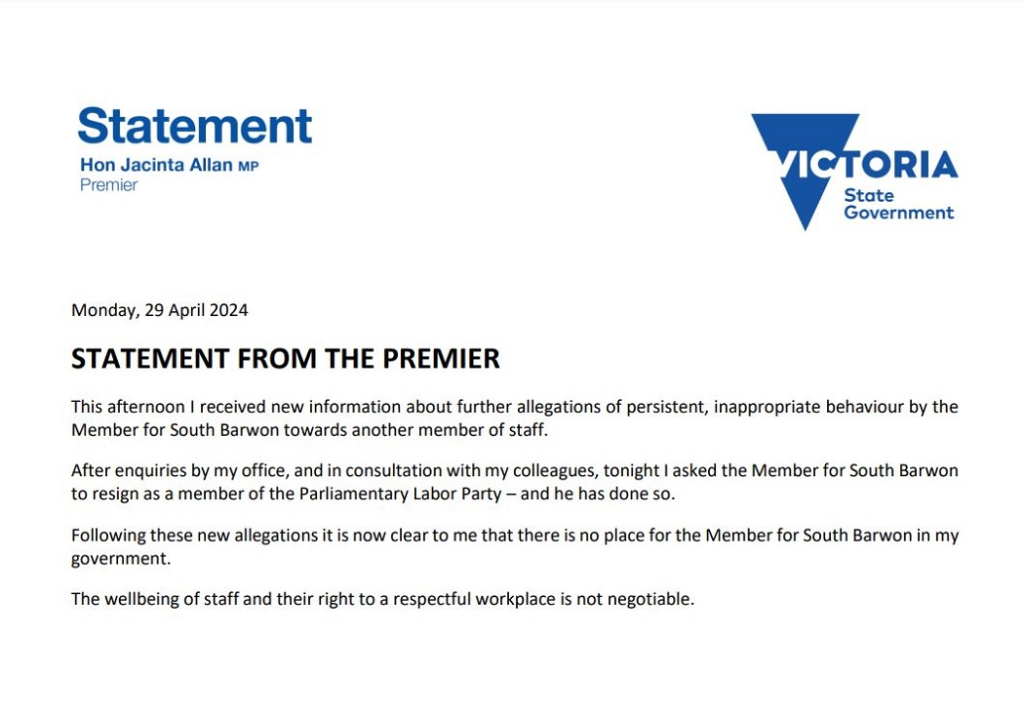 “Ofisim tarafından yapılan soruşturmaların ardından ve meslektaşlarımla istişarede bulunduktan sonra, bu gece Güney Barwon Üyesi’nden Parlamento İşçi Partisi üyeliğinden istifa etmesini istedim ve o da bunu yaptı.”