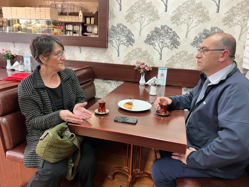 Sweet World pastanesinde buluştuğumuz Vamvakinou, o anda orada bulunan Emlakçı Halil Okur ile bölgedeki ev fiyatları ve faiz artışının piyasaya etkisini konuştu. Iraklı bir aile yanına gelerek fotoğraf çektirdi.