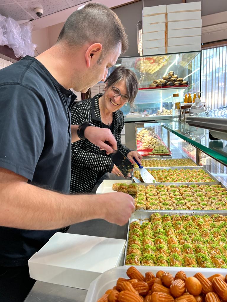 İşyeri sahibi Sedat Özdemiroğlu sohbet eden Vamvakionu, kendilerinin de evde nasıl baklava yaptığını anlattı.