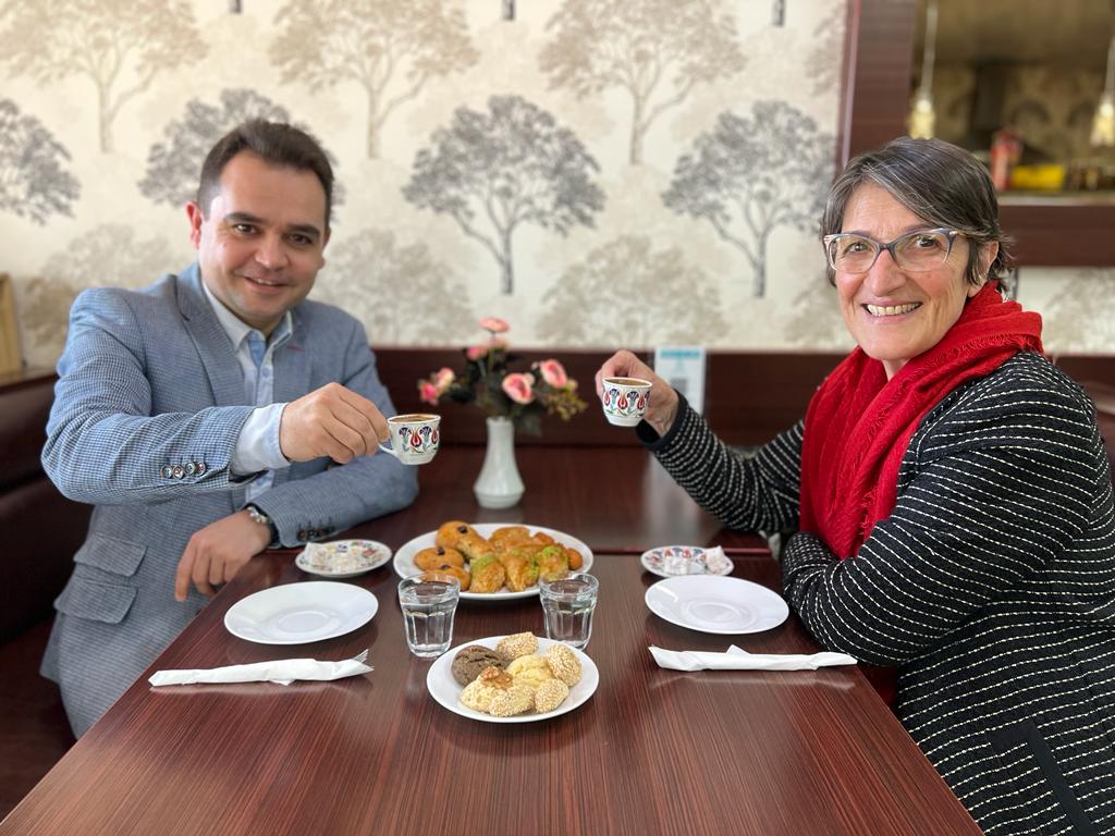 İşyeri sahibi Sedat Özdemiroğlu sohbet eden Vamvakinou, kendilerinin de evde baklava yaptığını anlattı. Ekmek Kadayıfını çok sevdiğini söyleyen Vamvakinou, tatlı ve kuru pasta çeşitlerinin bolluğuna hayran kalarak, Özdemiroğlu’nun çok iyi iş çıkardığını ve burada sadece Türk müşterilerini değil diğer millet ve kültürlerden insanları da görmek çok güzel dedi.