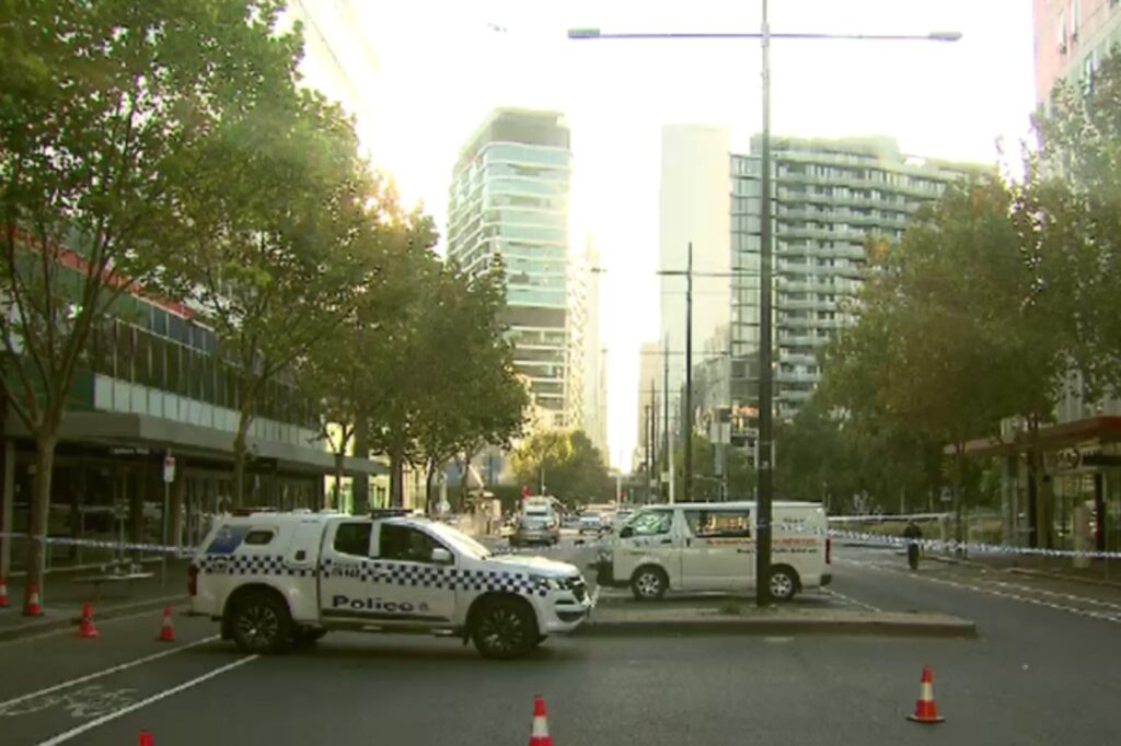 Polis, Docklands’daki bıçaklamanın yaşandığı olay yerinde. Kredi: 9 News