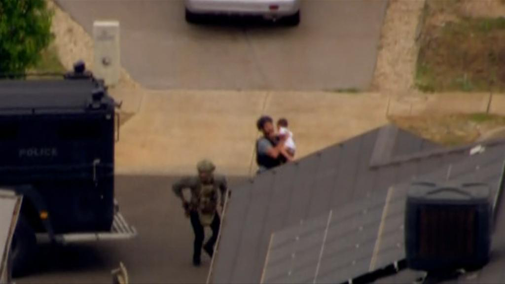 Ali’nin oğlu, bir pencereden evden kurtarıldı ve polis memuruna teslim edildi. Kaynak: 7NEWS
