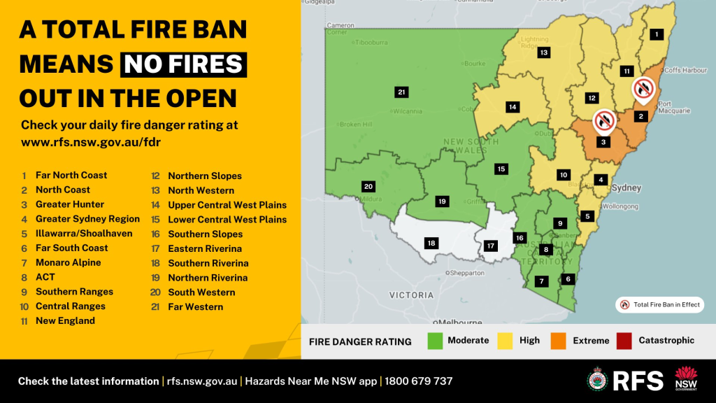 Yangınlar özellikle eyaletin kuzey kıyısı ve Greater Hunter bölgelerinde yoğunlaşıyor. Bu bölgelerde, 6 Ekim 2025 Çarşamba günü için tam yangın yasağı (Total Fire Ban) getirildi. Bu karar, sıcak, kuru ve rüzgârlı hava koşullarının yangın riskini önemli ölçüde artırması üzerine alındı. RFS resmi sitesinden tüm yangınlarla ilgili bilgilere ulaşabilirsiniz