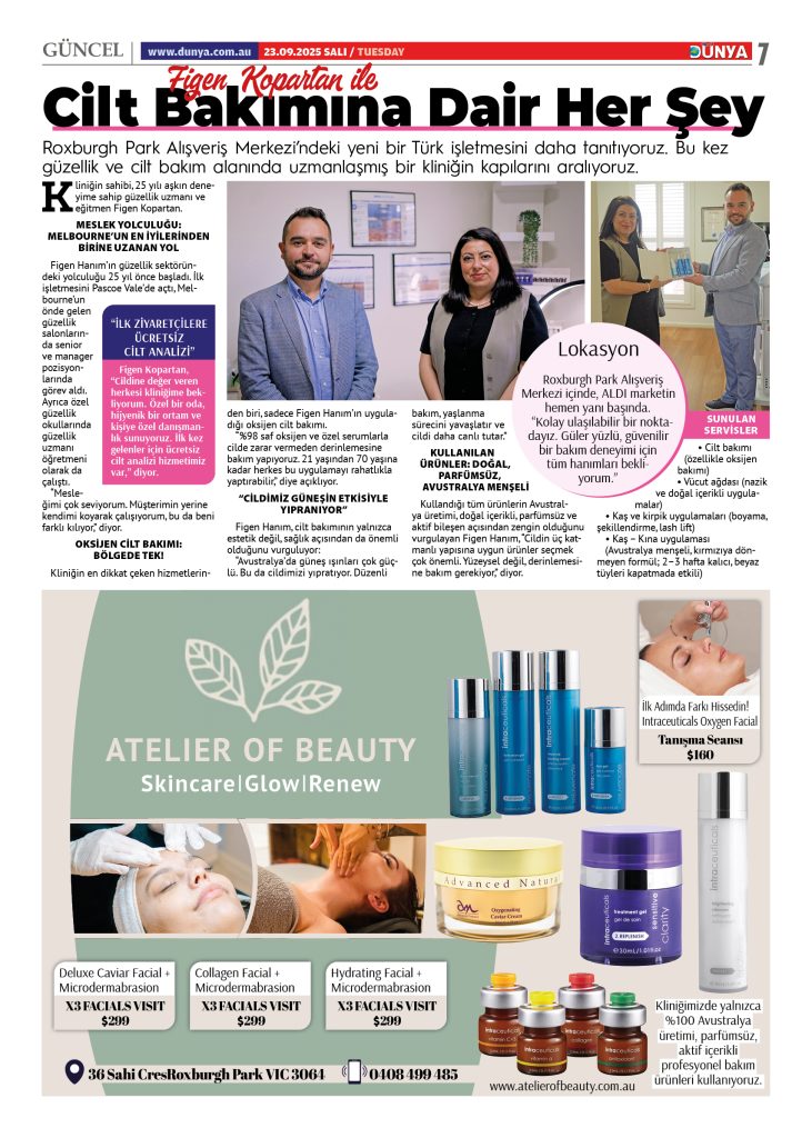 Roxburgh Park Alışveriş Merkezi’ndeki yeni bir Türk işletmesini daha tanıtıyoruz. Bu kez güzellik ve cilt bakım alanında uzmanlaşmış bir kliniğin kapılarını aralıyoruz. Kliniğin sahibi, 25 yılı aşkın deneyime sahip güzellik uzmanı ve eğitmen Figen Kopartan.