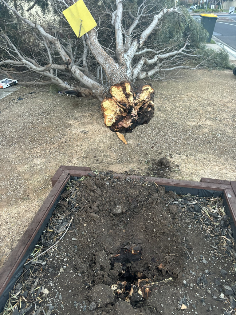 Altona Meadows’ta yaşayan bir sakin, pazartesi gece boyunca etkili rüzgârlar nedeniyle bahçelerinde kökünden kopan büyük bir ağacı gösteren görüntüleri paylaştı.