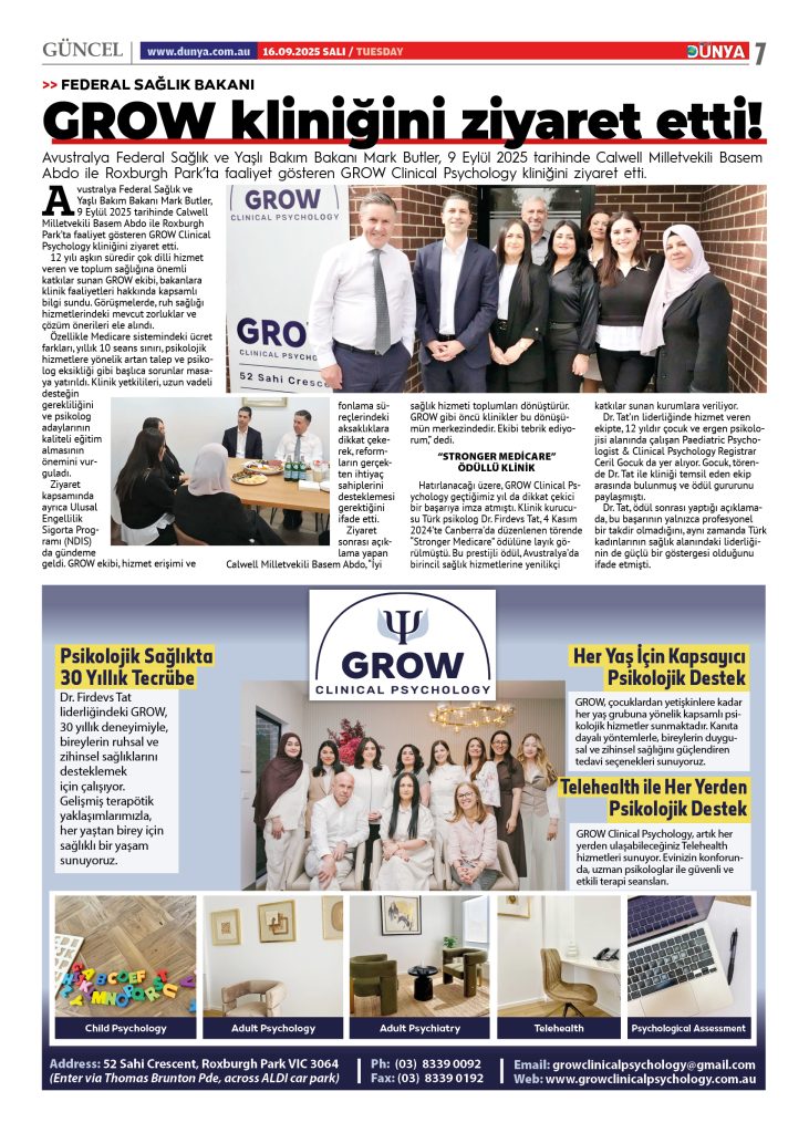 Hatırlanacağı üzere, GROW Clinical Psychology geçtiğimiz yıl da dikkat çekici bir başarıya imza atmıştı. Klinik kurucusu Türk psikolog Dr. Firdevs Tat, 4 Kasım 2024’te Canberra’da düzenlenen törende “Stronger Medicare” ödülüne layık görülmüştü. Bu prestijli ödül, Avustralya’da birincil sağlık hizmetlerine yenilikçi katkılar sunan kurumlara veriliyor.