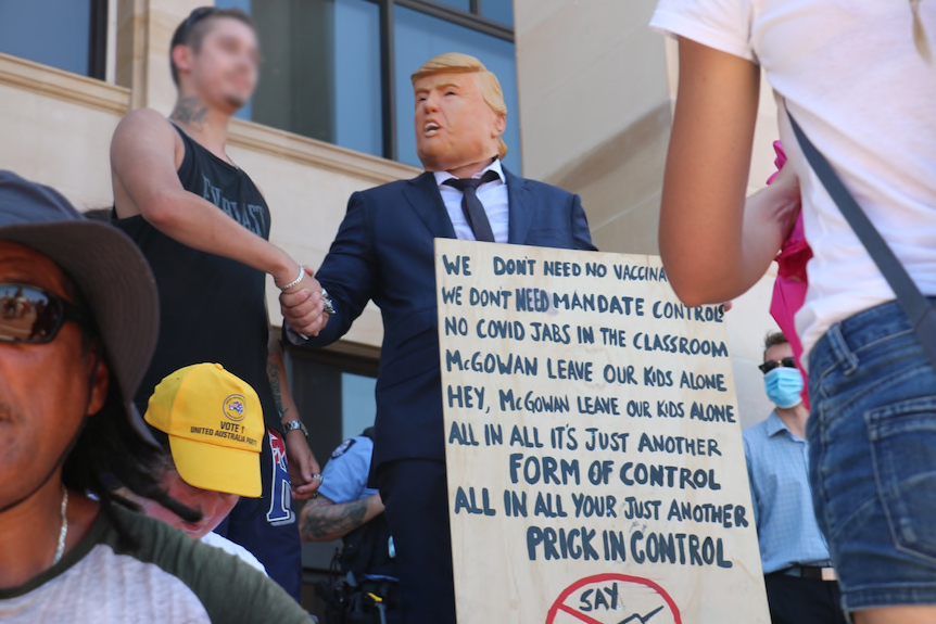 Donald Trump gibi giyinmiş bir erkek, geçtiğimiz hafta Batı Avustralya parlamento binasının dışındaki protestocular arasındaydı ve sırtında bir gamalı haç bulunan bir işaret sallıyordu.