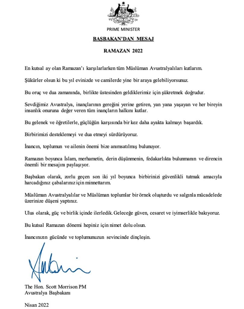 Scott Morrison’dan TÜRKÇE Ramazan mesajı