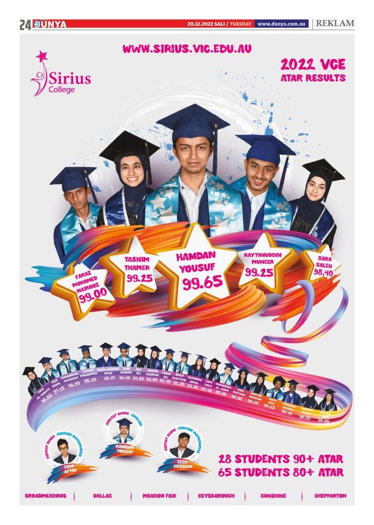 VCE sınavlarında her yıl elde ettiği yüksek puanlarla eyalette adından söz ettiren Sirius Koleji, bu sene de başarısını yineledi. Kolejin 4 öğrencisi 99’un üzerinde ATAR puanı aldı. Okulun en yüksek puanını ise 99.65 ATAR puanı ile Hamdan Yousuf elde etti.
