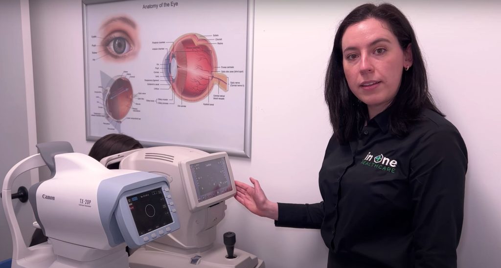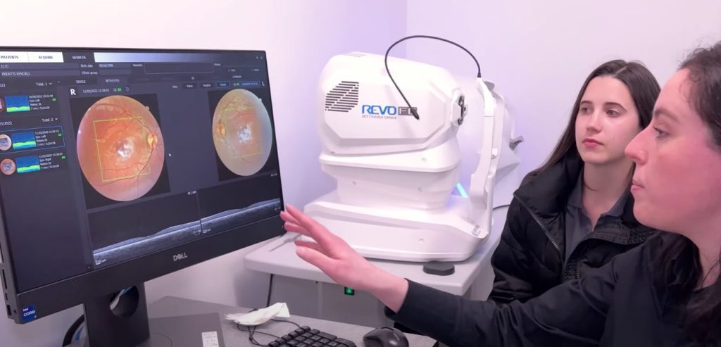 Cihazlar hakkında bilgi veren optometri uzmanı, “Bu makine (aşağıdaki); kuru göz, diyabet, göz tansiyonu ve sarı nokta hastalığı gibi gözün hem ön hem de arkasındaki hastalıkları saptamamız sağlar.