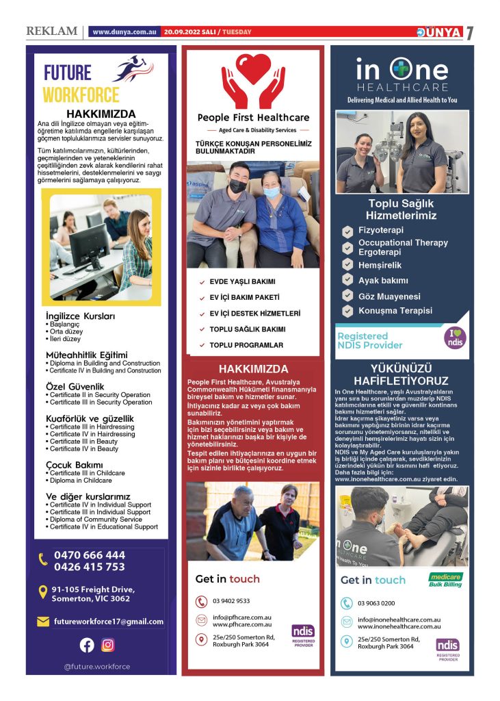 Sağlık merkezi içerisinde, Yaşlılık bakım ve NDIS hizmetleri dışında; göz muayenesi, Fizyoterapi, Hemşirelik, ayak bakımı, Konuşma Terapisi gibi hizmetlerde sunulmakta.