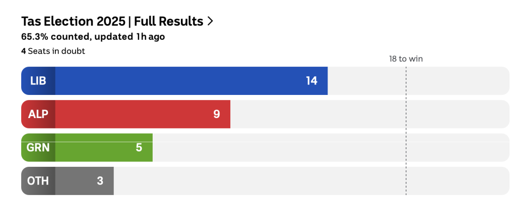 İşçi Partisi kesin olarak sekiz sandalye kazanırken, toplamda 10 sandalyesini koruması bekleniyor. Greens Partisi en az beş sandalye elde ederken, Kristie Johnston, Craig Garland ve Peter George olmak üzere üç bağımsız aday seçilmeyi başardı. Franklin’den David O’Byrne’nin de sandalyesini koruması muhtemel görünüyor.